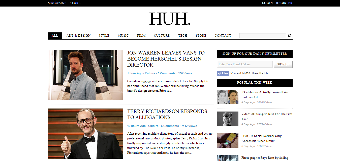 The first thing was the title of the site 'HUH' placed at the top centre of the page in the largest point size - this will help enforce the brand and make it clear what site you are using.